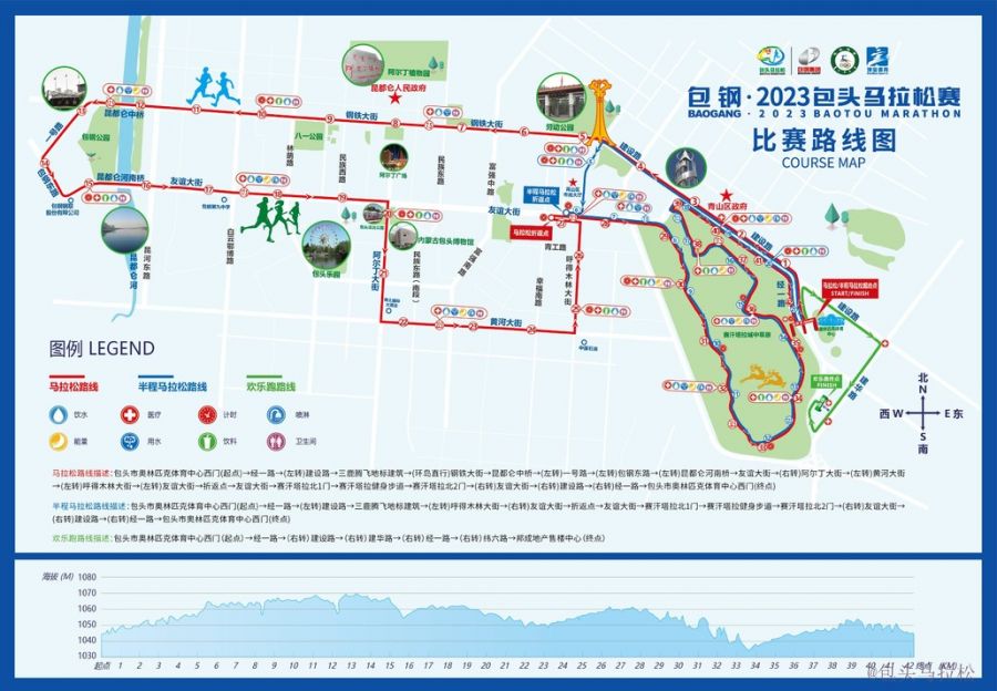 圆素提醒:包头马拉松赛将于6月23日7点30分开跑,,,,,,,所有参赛选手领取物料时间为6月20日(周二)9:00 — 18:00、6月21日(周三)9:00 — 18:00、6月22日(周四)9:00 — 21:00,,,,,,,所在为包头奥林匹克体育中心(北门),,,,,,,角逐蹊径图如下: