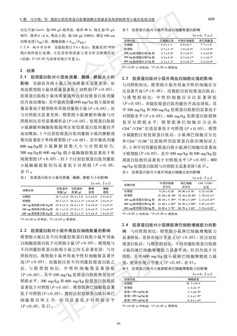 腹腔注射胶原卵白肽增强糖皮质激素免疫抑制模子小鼠的免疫功效